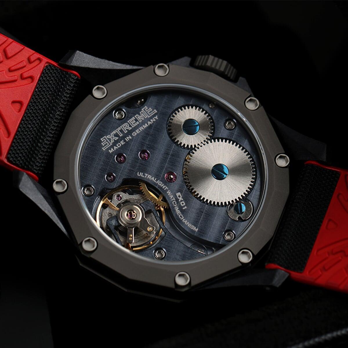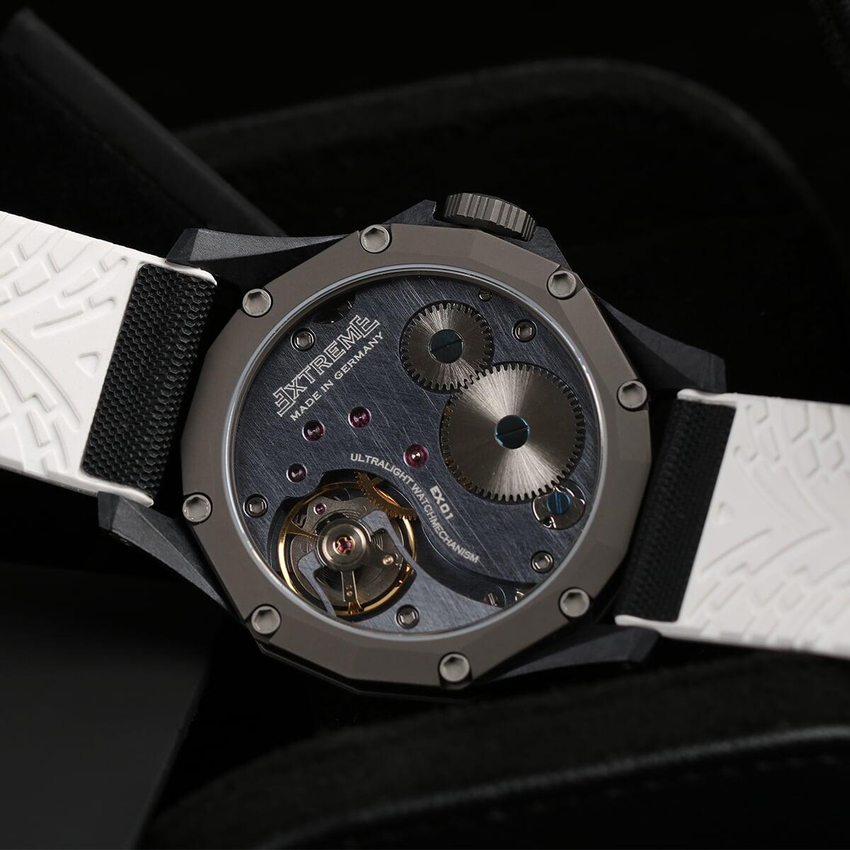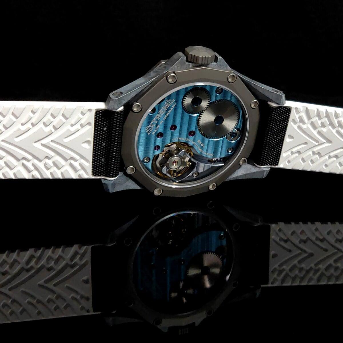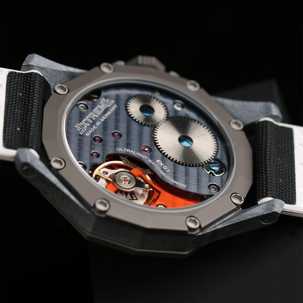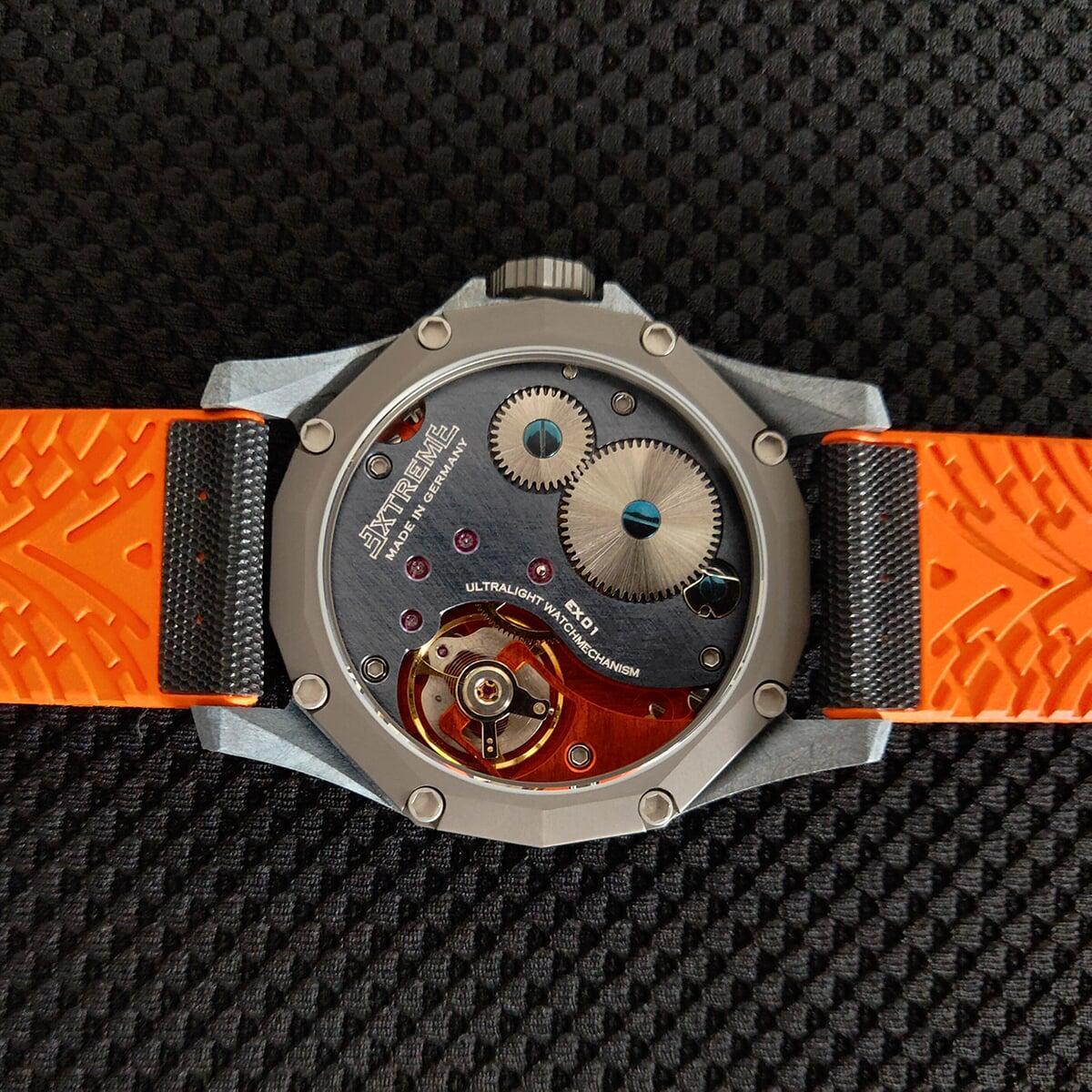 EX001 movement is an in-house designed and produced movement inside X1 model, made in Germany. The same aluminum we see in the EXTREME movement is used in aerospace programs for building the rockets which is definitely the answer for all questions about reliability of this material.
