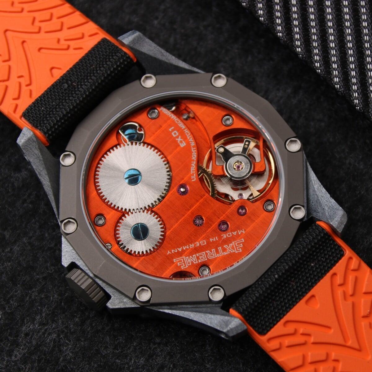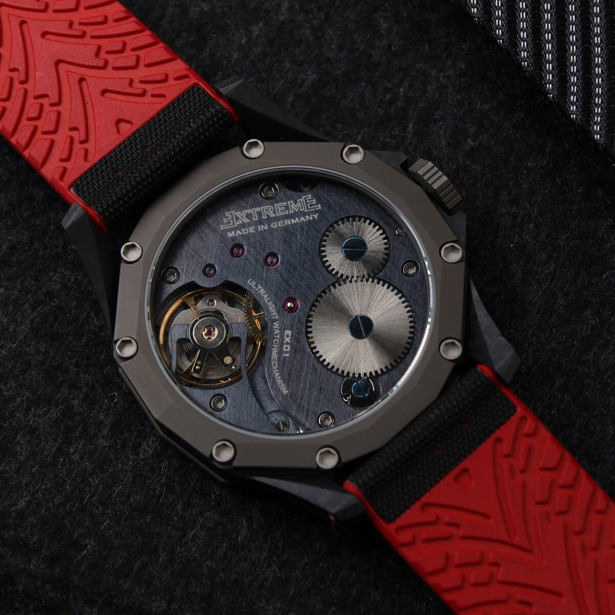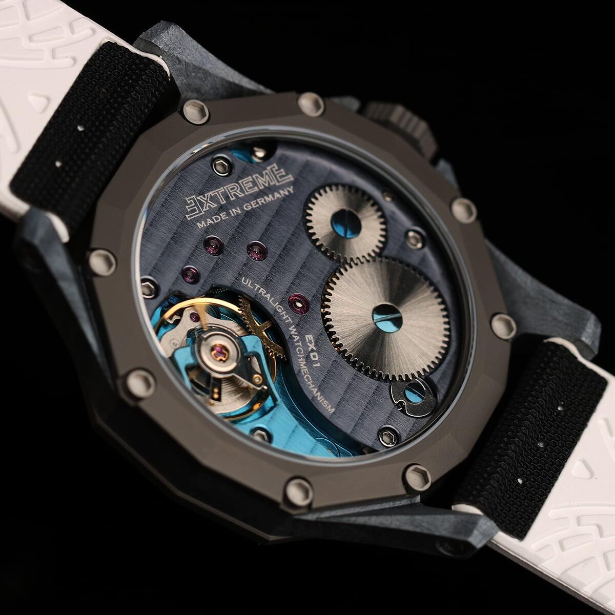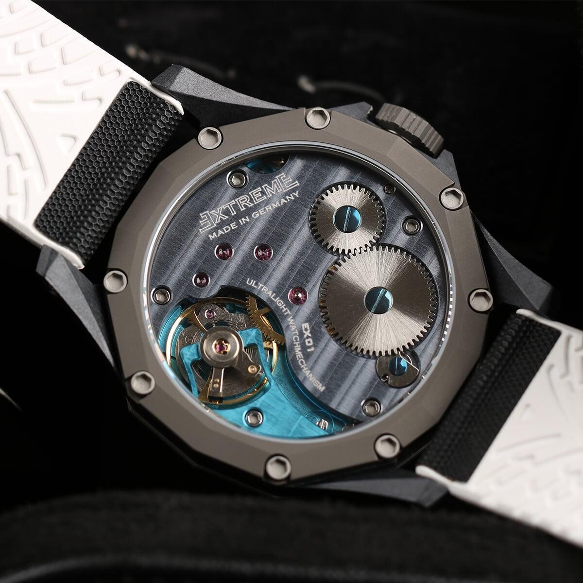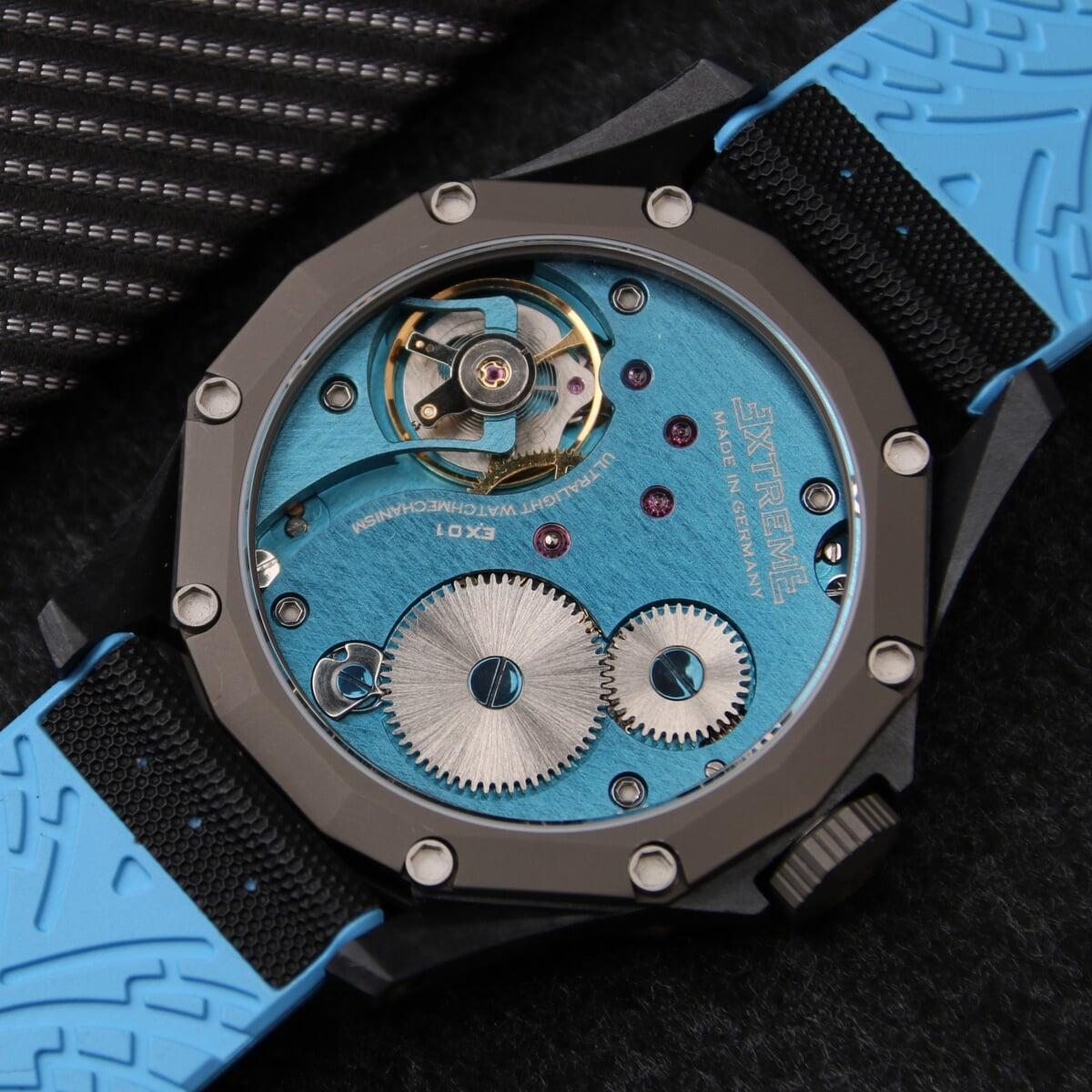 EX001 movement is an in-house designed and produced movement inside X1 model, made in Germany. The same aluminum we see in the EXTREME movement is used in aerospace programs for building the rockets which is definitely the answer for all questions about reliability of this material.