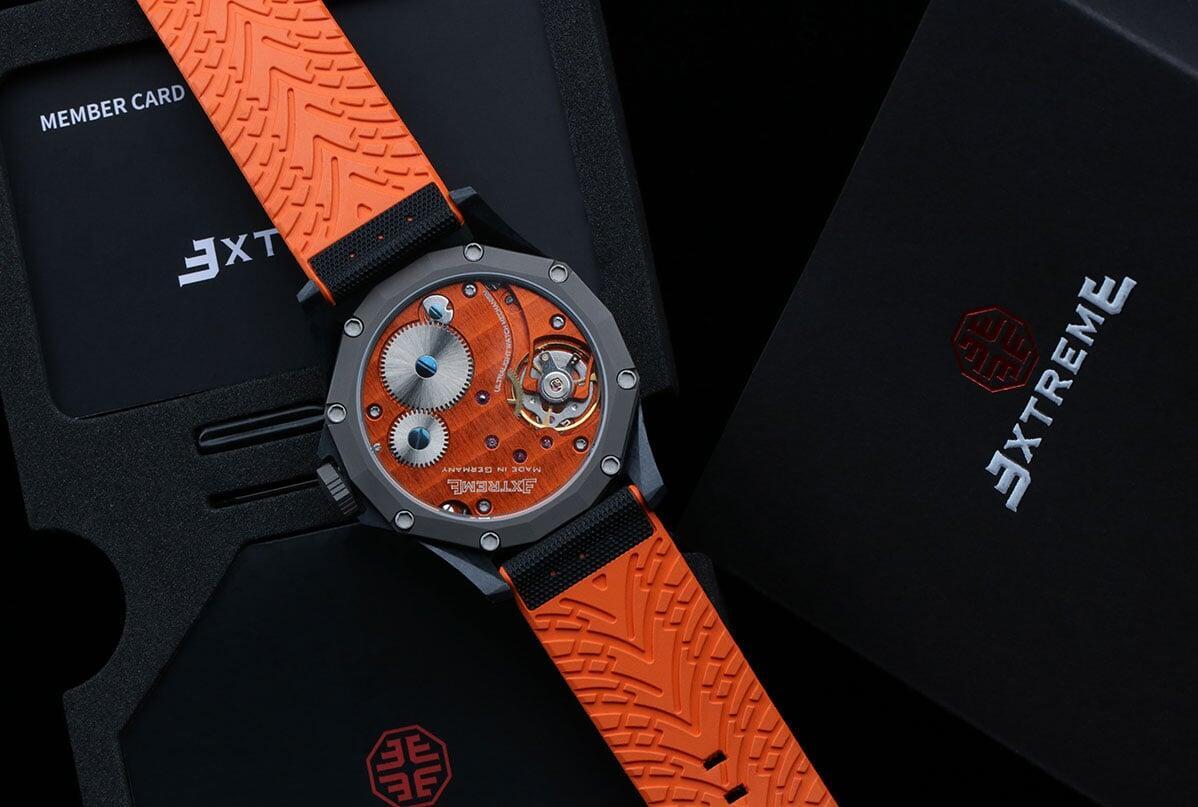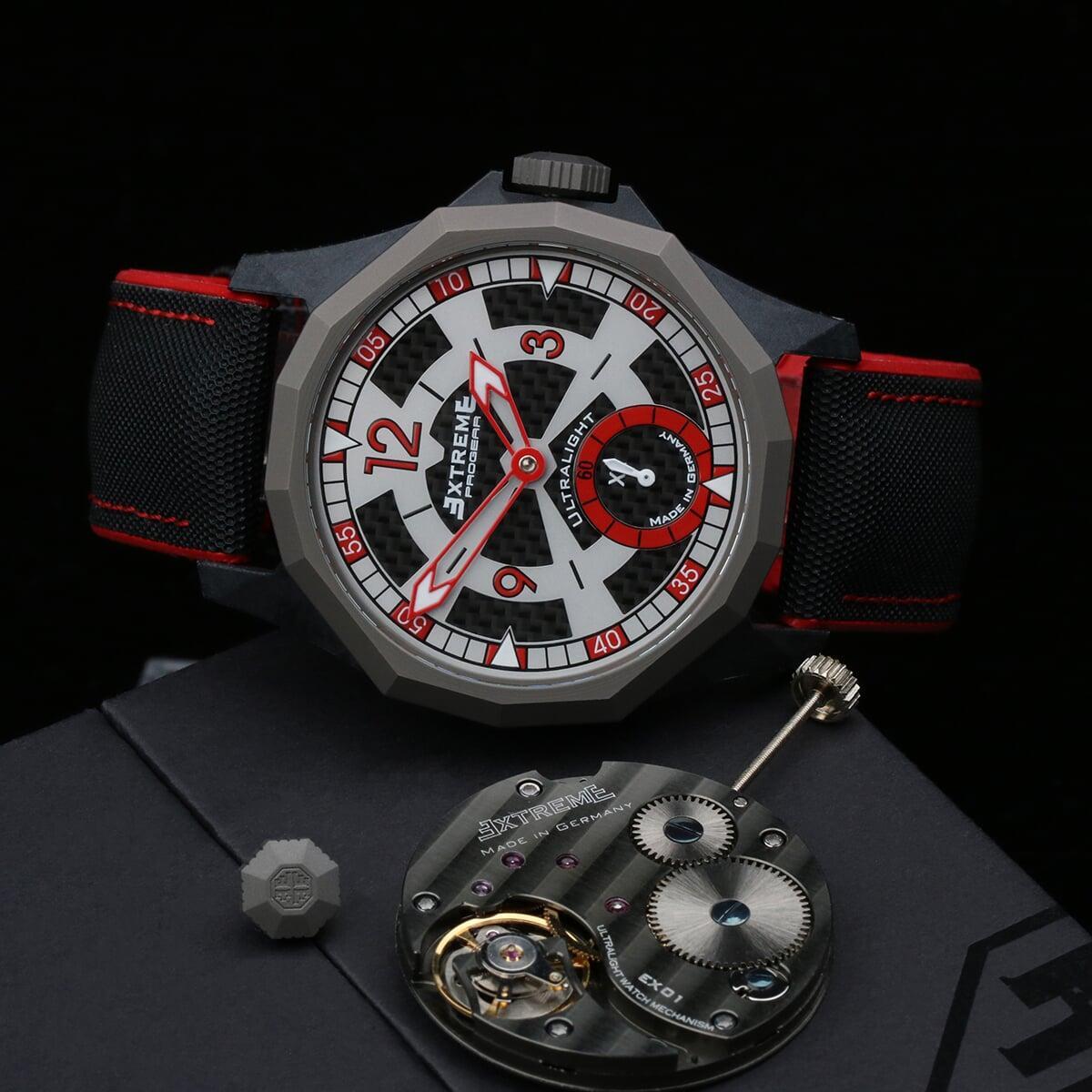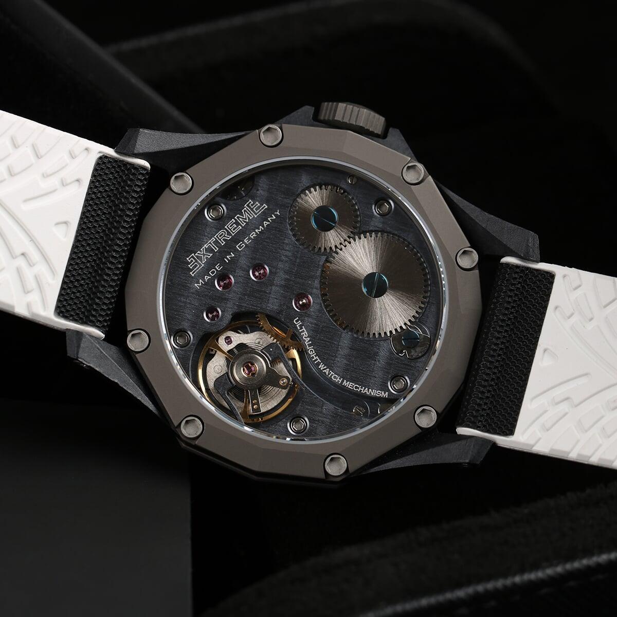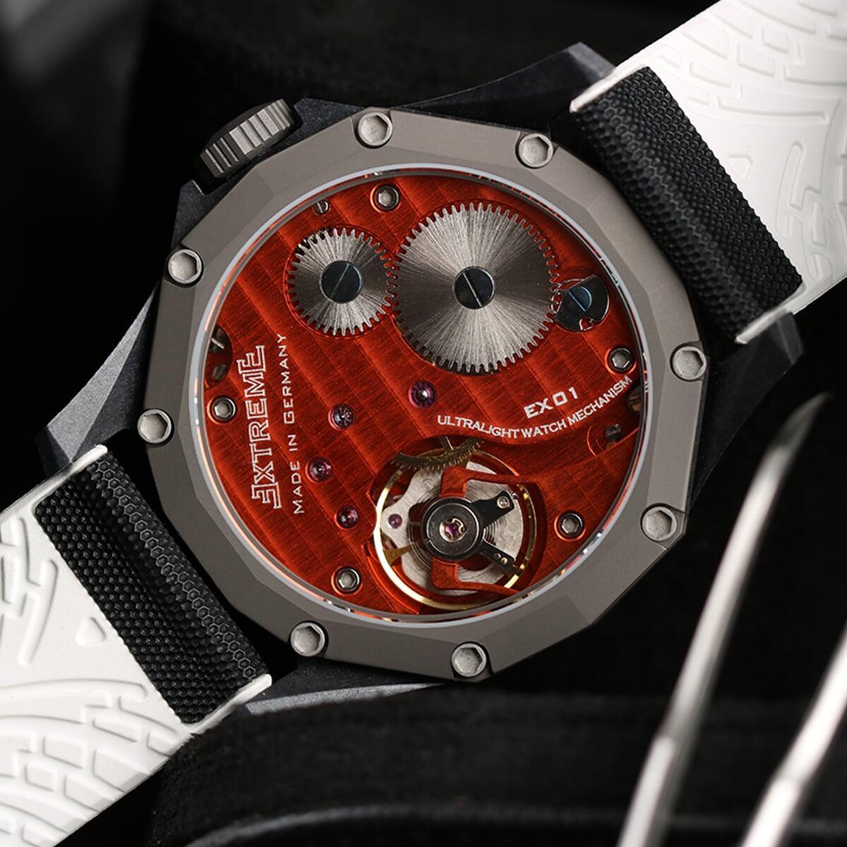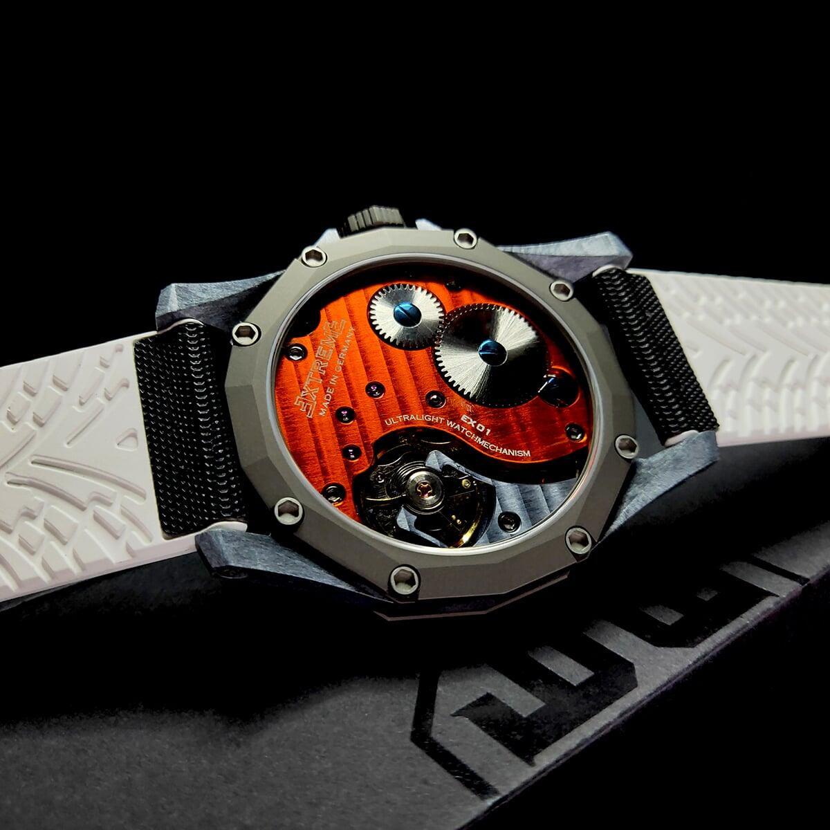 EX001 movement is an in-house designed and produced movement inside X1 model, made in Germany. The same aluminum we see in the EXTREME movement is used in aerospace programs for building the rockets which is definitely the answer for all questions about reliability of this material.