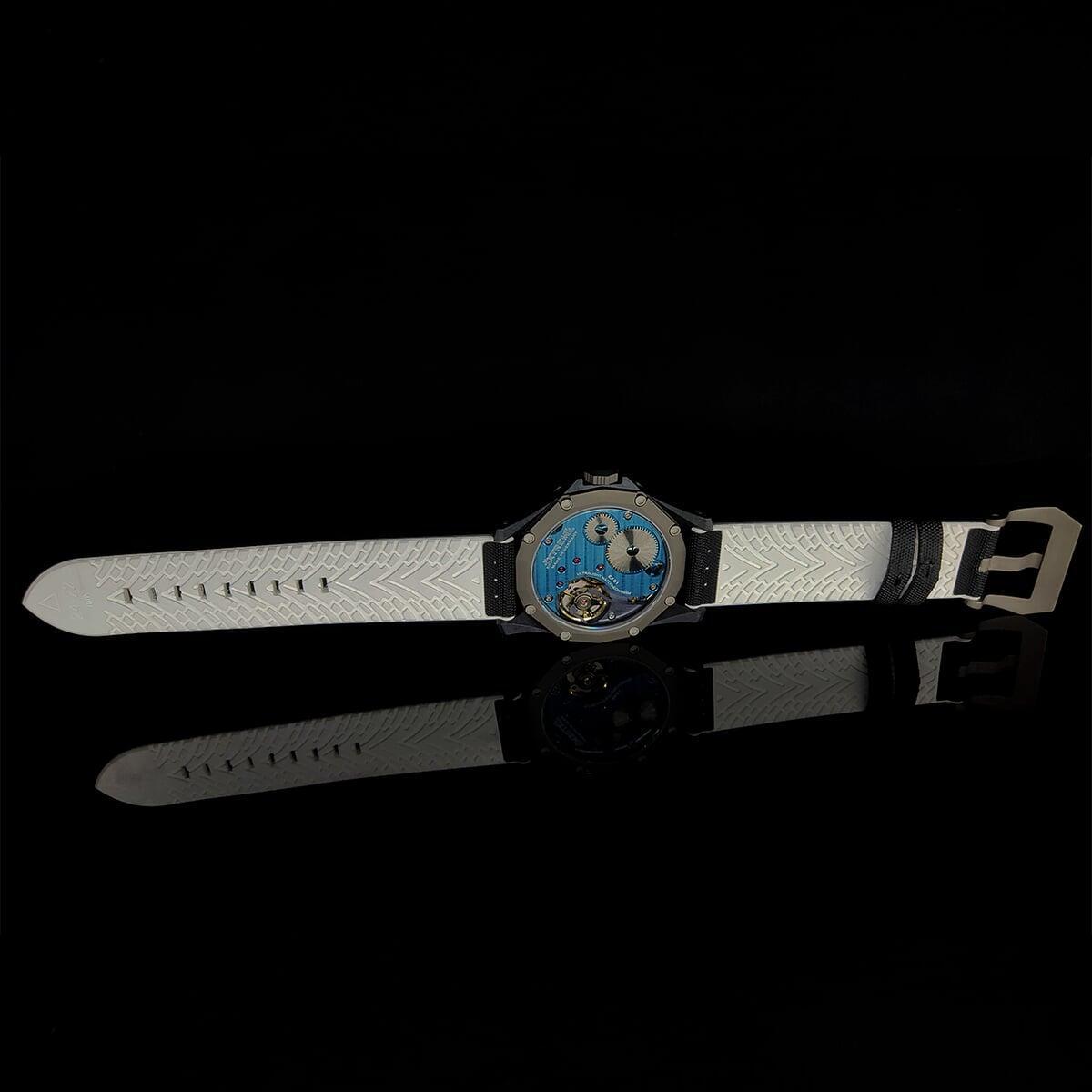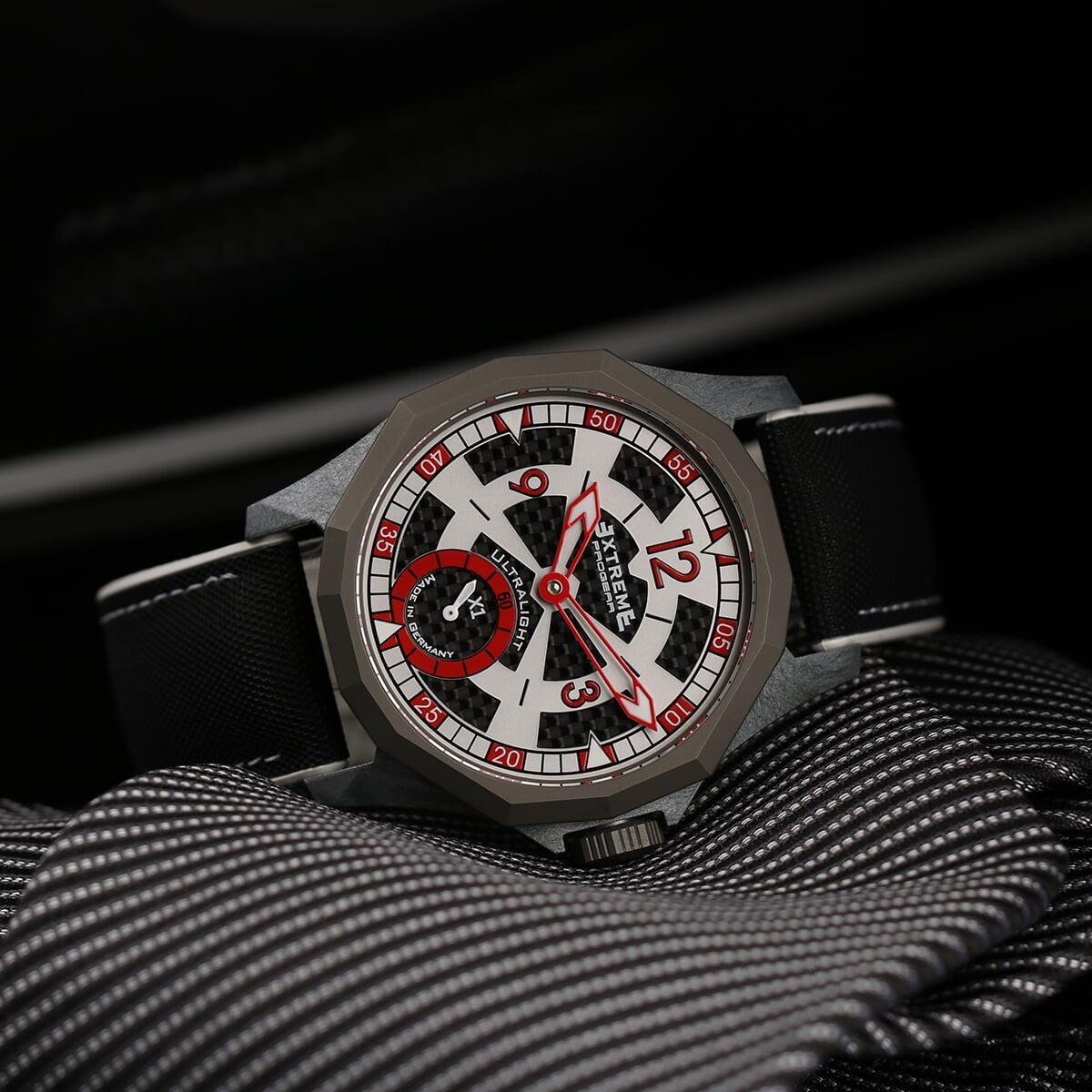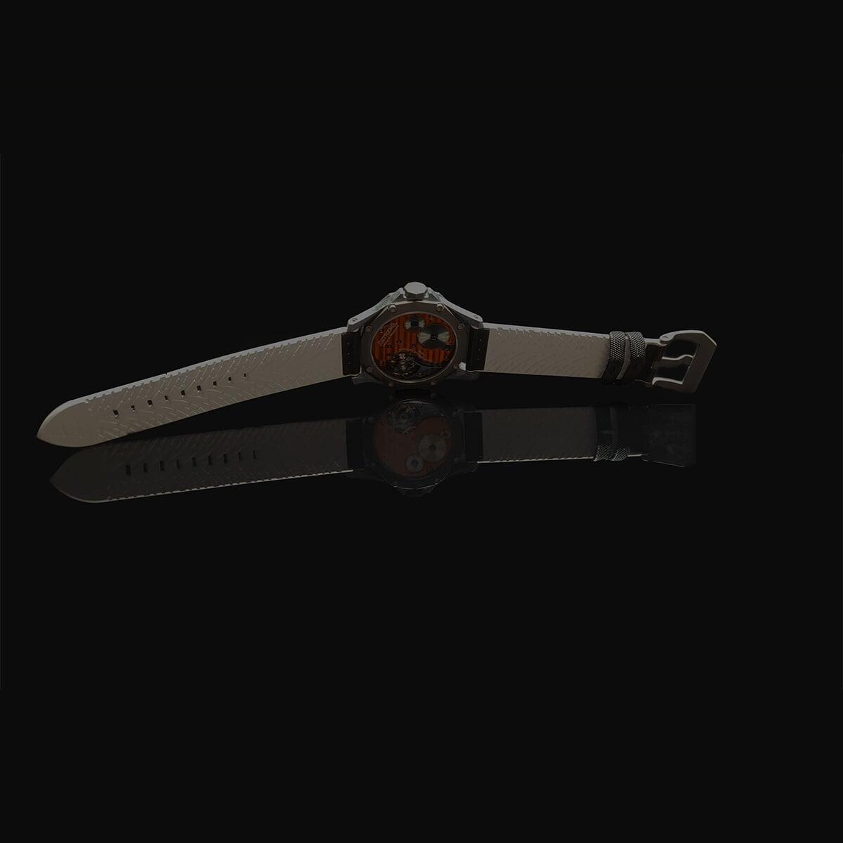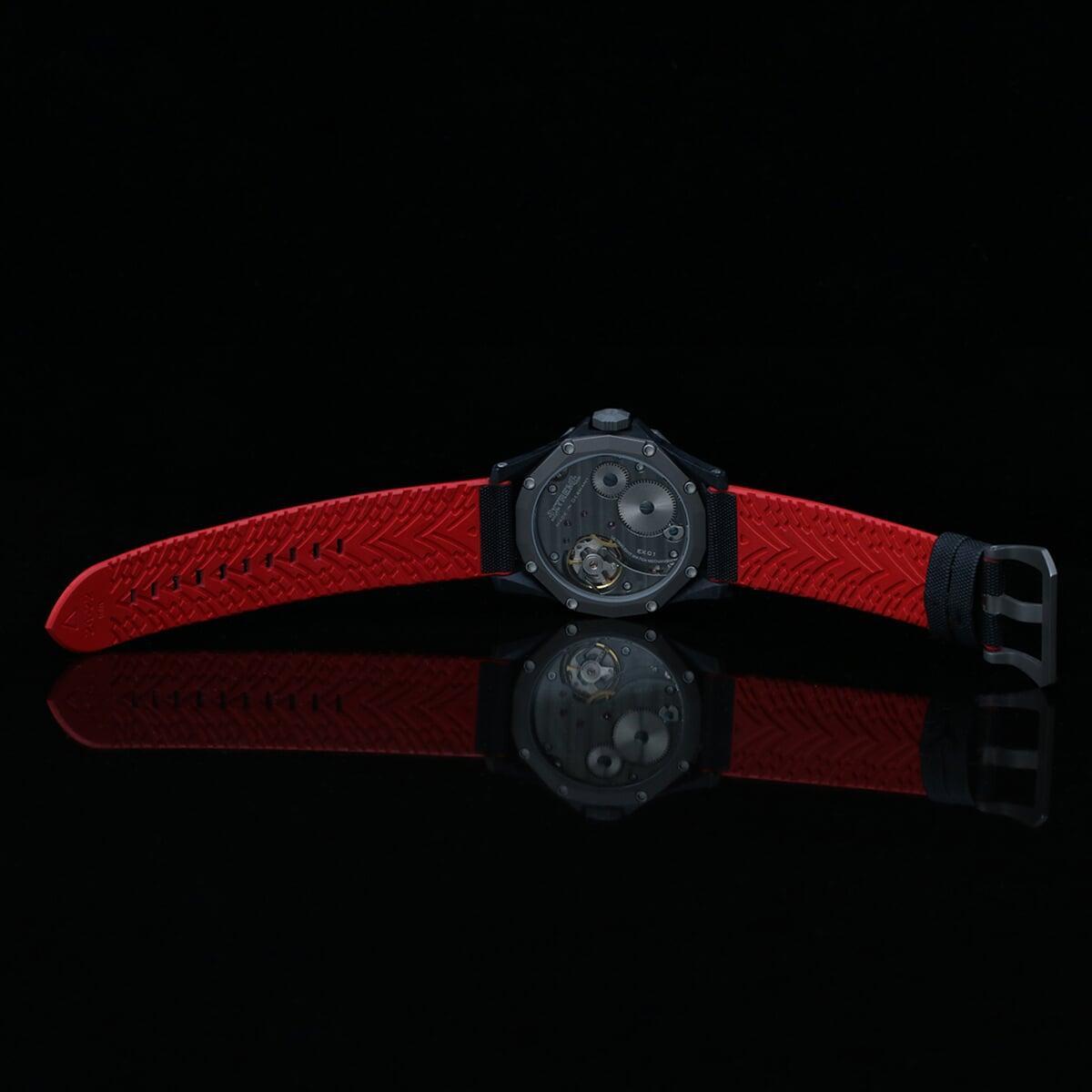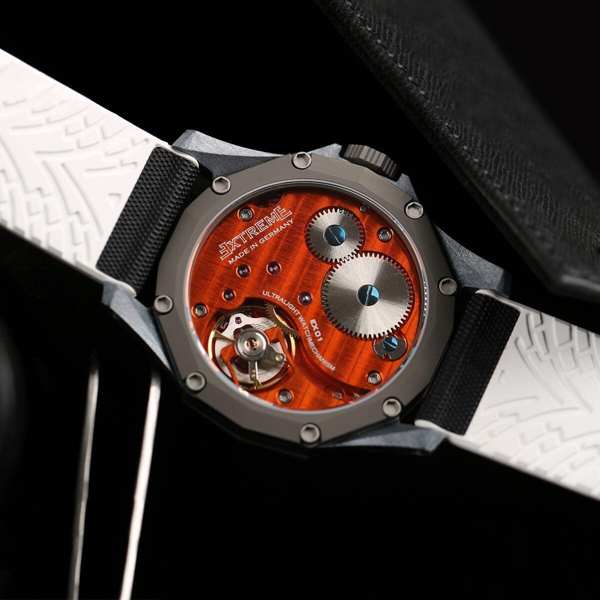 EX001 movement is an in-house designed and produced movement inside X1 model, made in Germany. The same aluminum we see in the EXTREME movement is used in aerospace programs for building the rockets which is definitely the answer for all questions about reliability of this material.