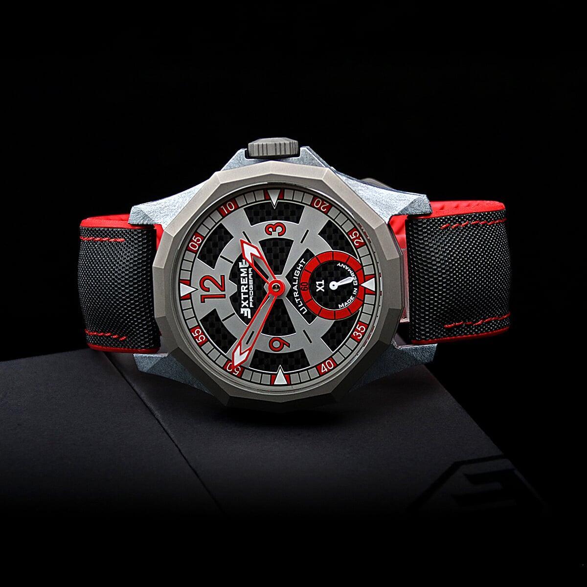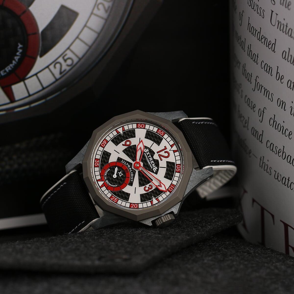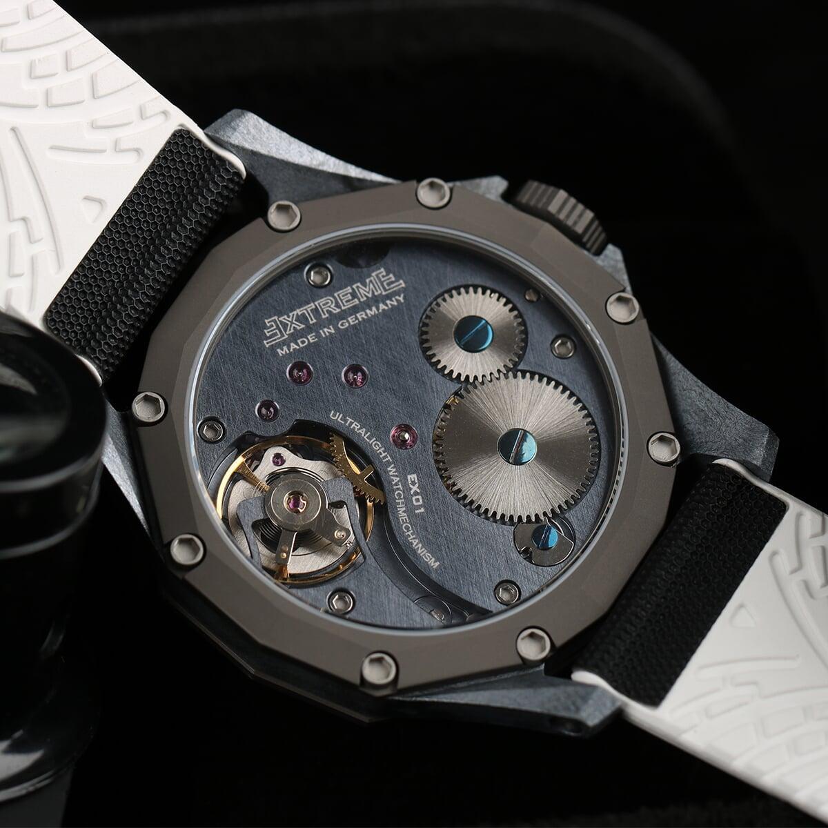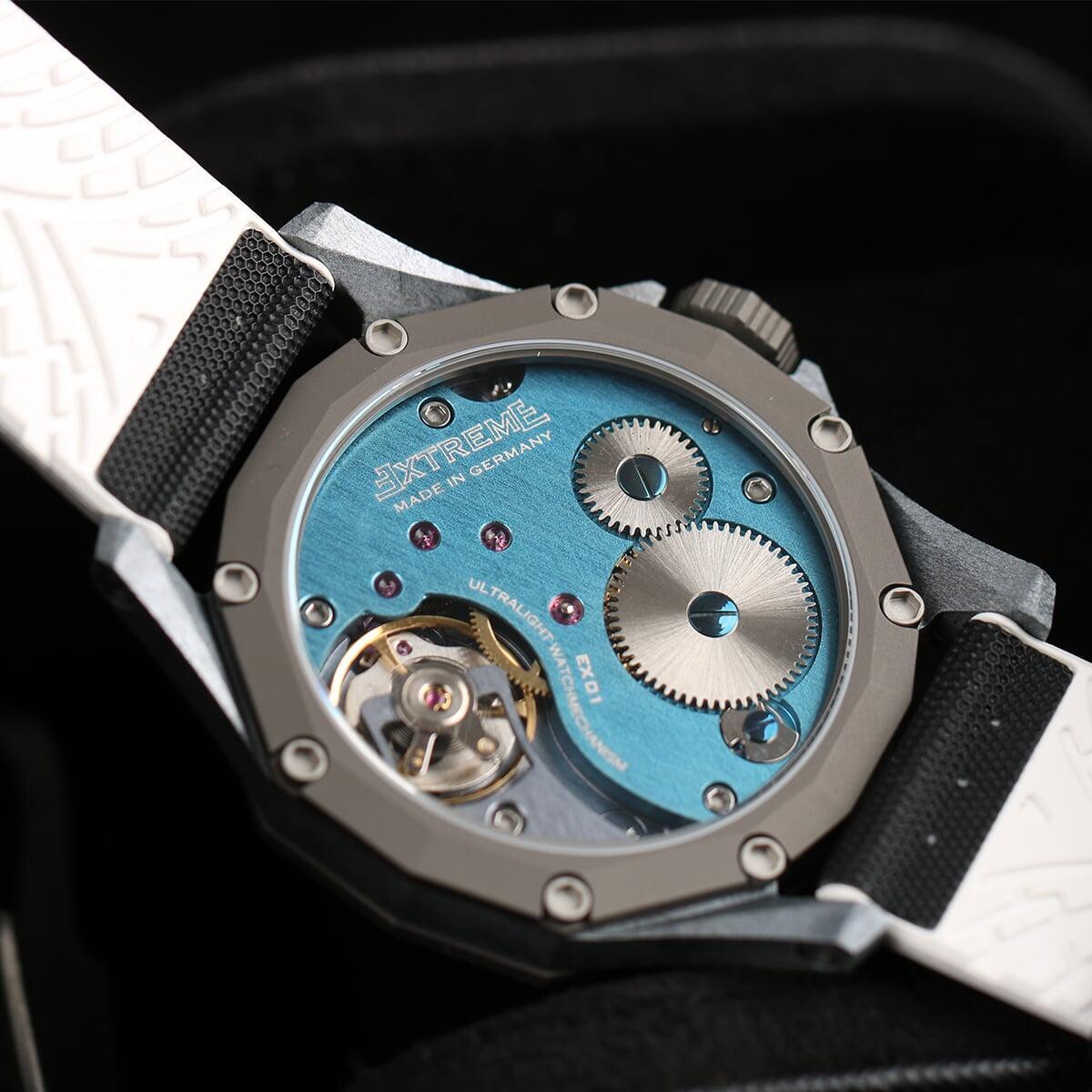 EX001 movement is an in-house designed and produced movement inside X1 model, made in Germany. The same aluminum we see in the EXTREME movement is used in aerospace programs for building the rockets which is definitely the answer for all questions about reliability of this material.
